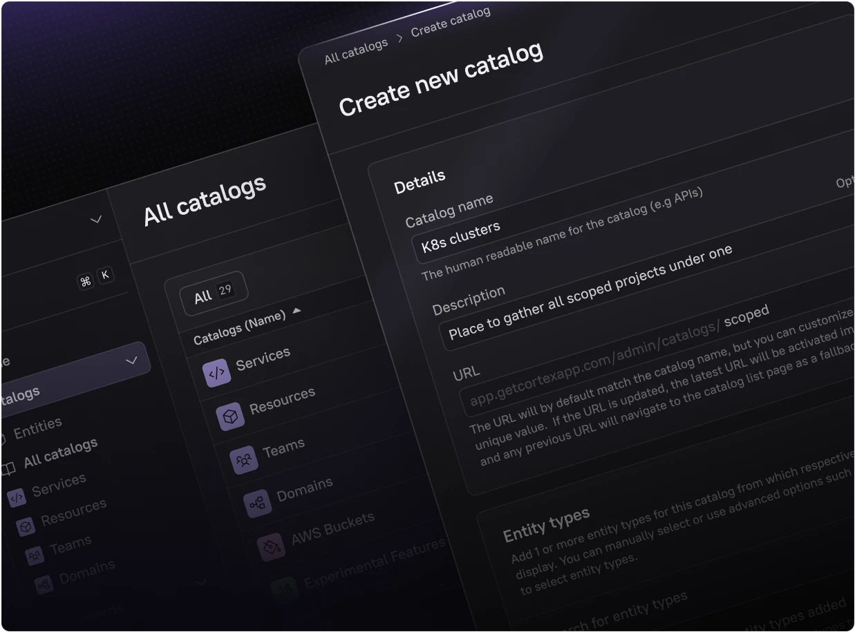Cortex’s catalogs are the foundation for engineering visibility and accountability – a flexible, connected source of truth for every service, infrastructure resource, and team.