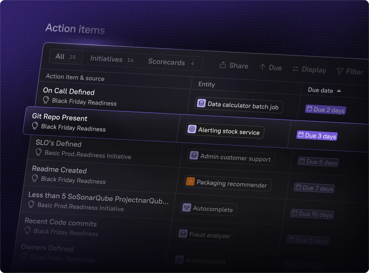 Define clear engineering standards and track team performance with the deepest, most customizable, and easiest-to-use Scorecards on the market. Drive accountability, improve quality, and accelerate initiatives.