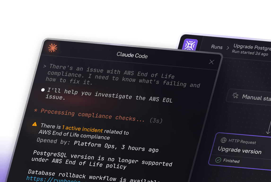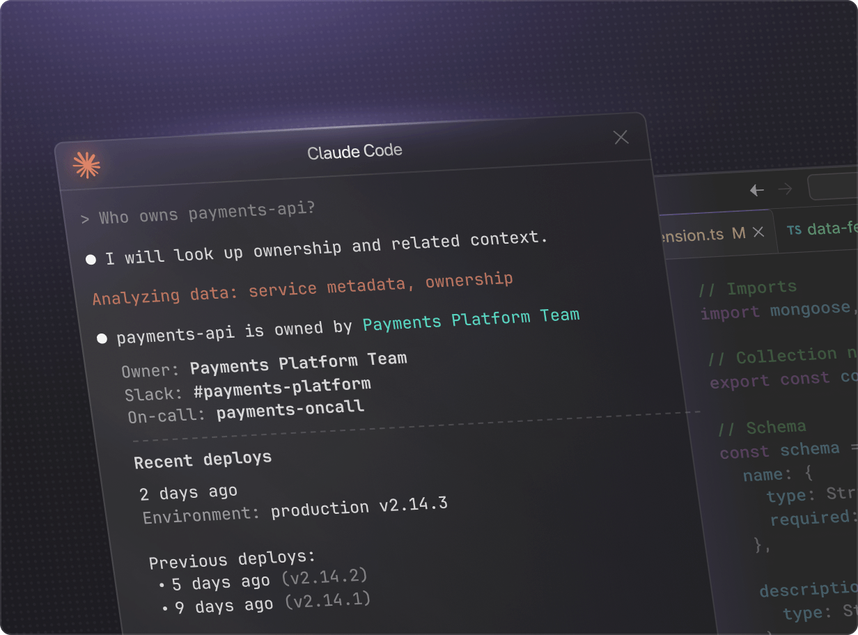 Ask questions in your IDE or AI assistant, like "Who owns payments-api?", "Show me the checkout runbook", "When was this last deployed?" Get accurate answers in seconds, without spending time searching.