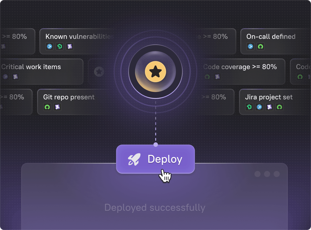 See clear standards and requirements for your services upfront. No surprise blockers when you try to deploy. Everything you need to meet production readiness in one place.