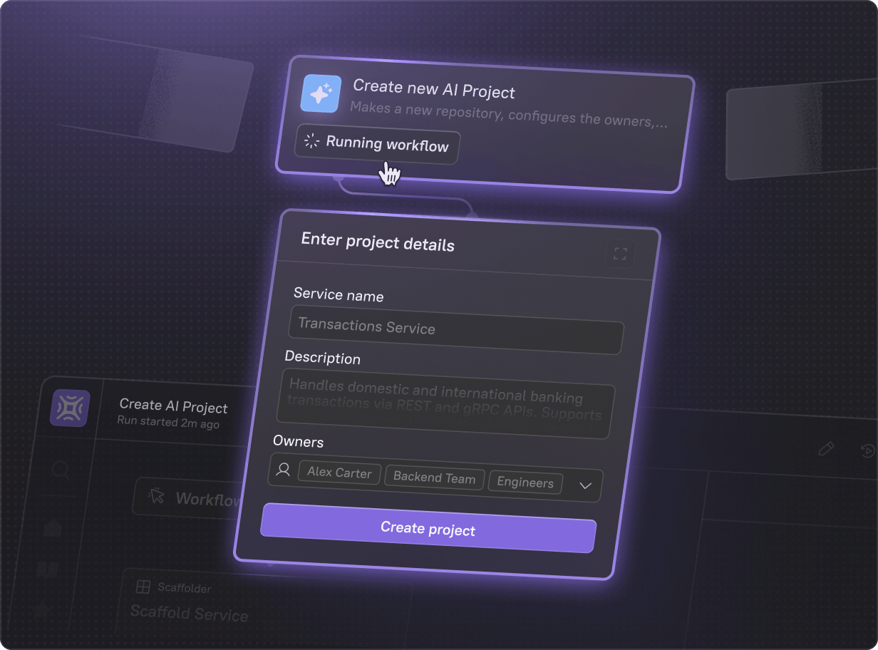 Scaffold new services, provision infrastructure, or trigger deployments with one click. All the best practices and requirements are built in.